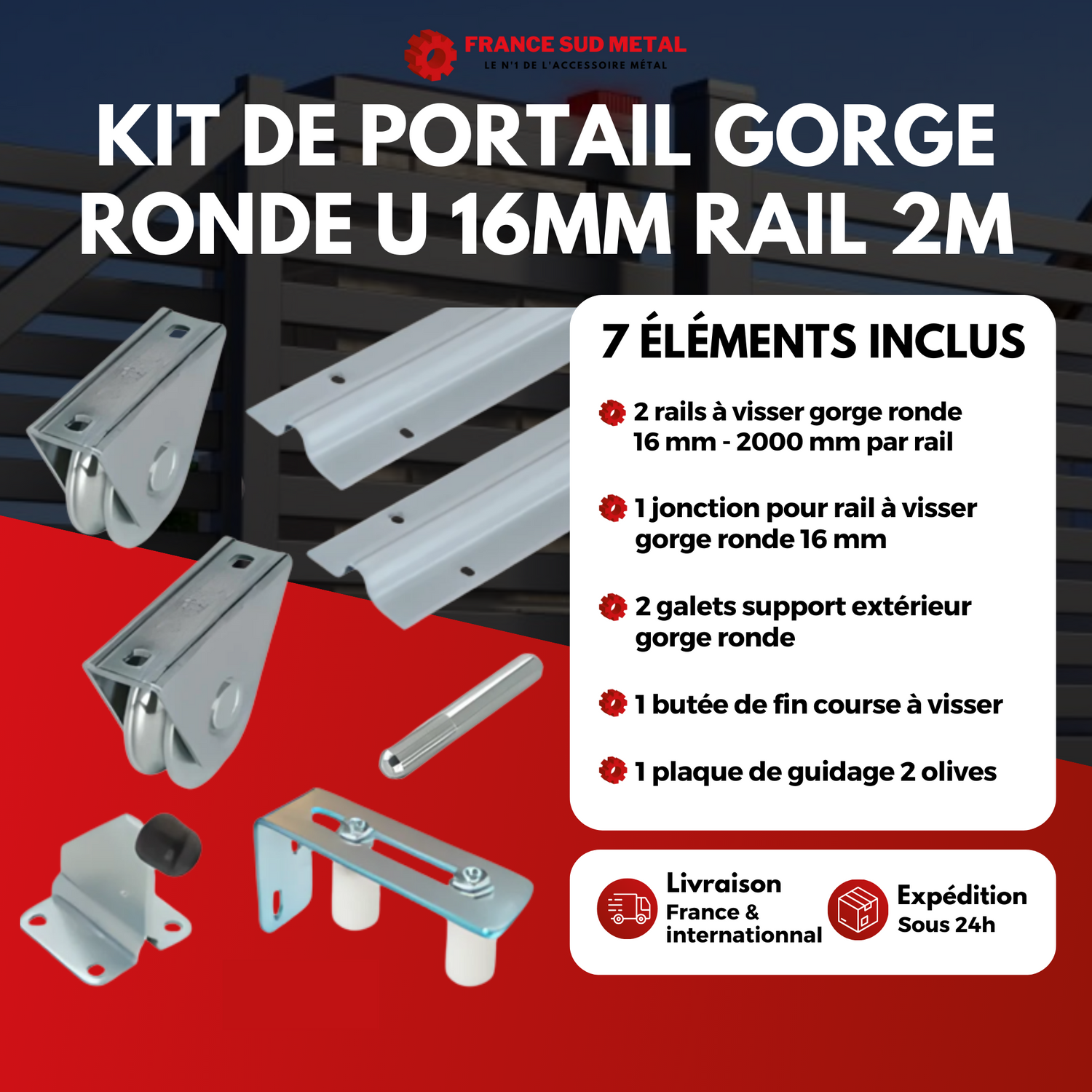 KIT DE PORTAIL 4 METRE ROUE GORGE RONDE U 16mm - 2 x RAIL 2 METRES