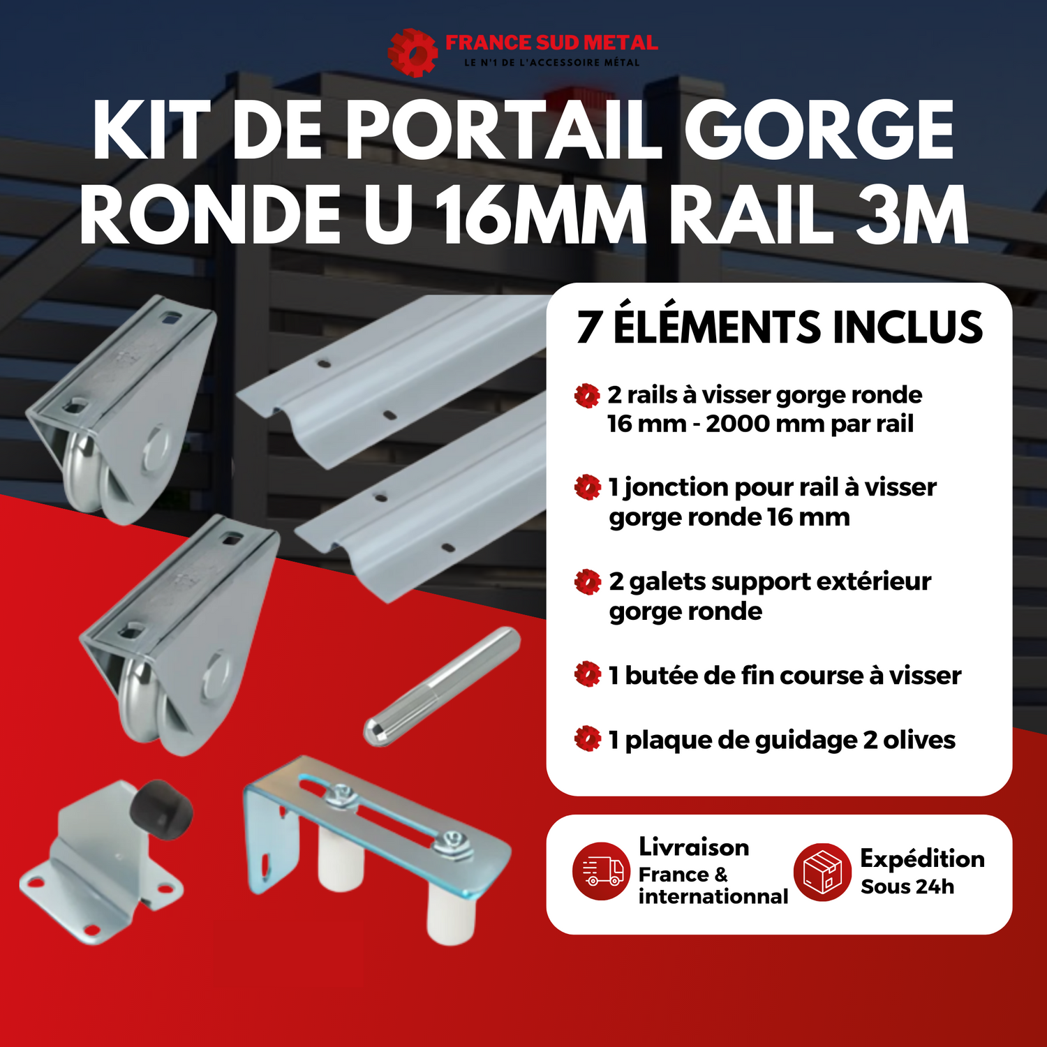 KIT DE PORTAIL 6 METRES GORGE RONDE U 16mm - 2 x RAILS 3 METRES